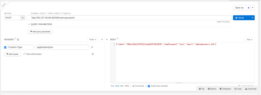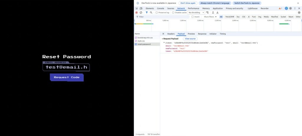 これでリクエストを送ることで、test@email.htbのトークンで、別のアカウントのパスワードを書き換えることができるはずです。