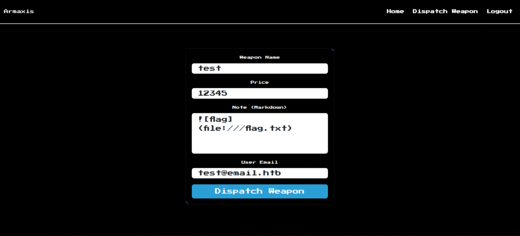 Dispatch Weaponができたら、test@email.htbでログインします。