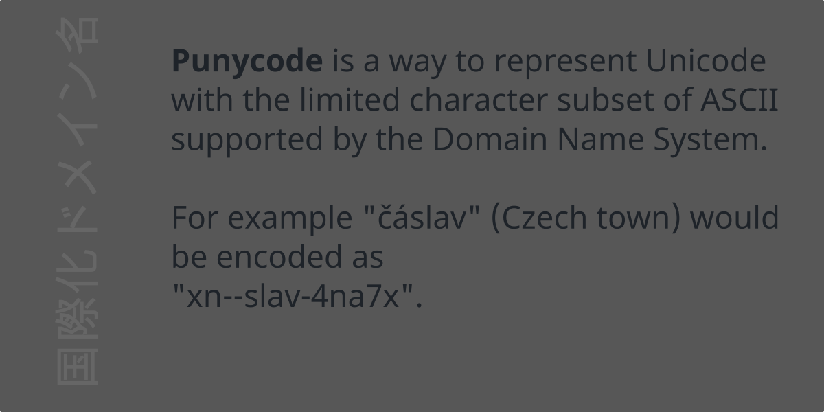 Punycodeは、国際化ドメイン名を既存のDNSで運用できるようにするためにUnicode文字列をアルファベット、数字、ハイフンの組み合わせに変換する符号化方式の一つです!